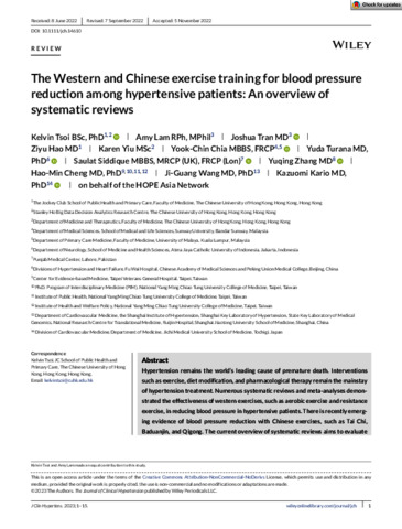 Tsoi, Kelvin and Lam, Amy and Tran, Joshua and Hao, Ziyu and Yiu, Karen and Chia, Yook Chin * and Turana, Yuda and Siddique, Saulat and Zhang, Yuqing and Cheng, Hao Min and Wang, Ji-Guang and Kario, Kazuomi and HOPE Asia Network (2023) The Western and Chinese exercise training for blood pressure reduction among hypertensive patients: An overview of systematic reviews. The Journal of Clinical Hypertension. ISSN 0748-450X